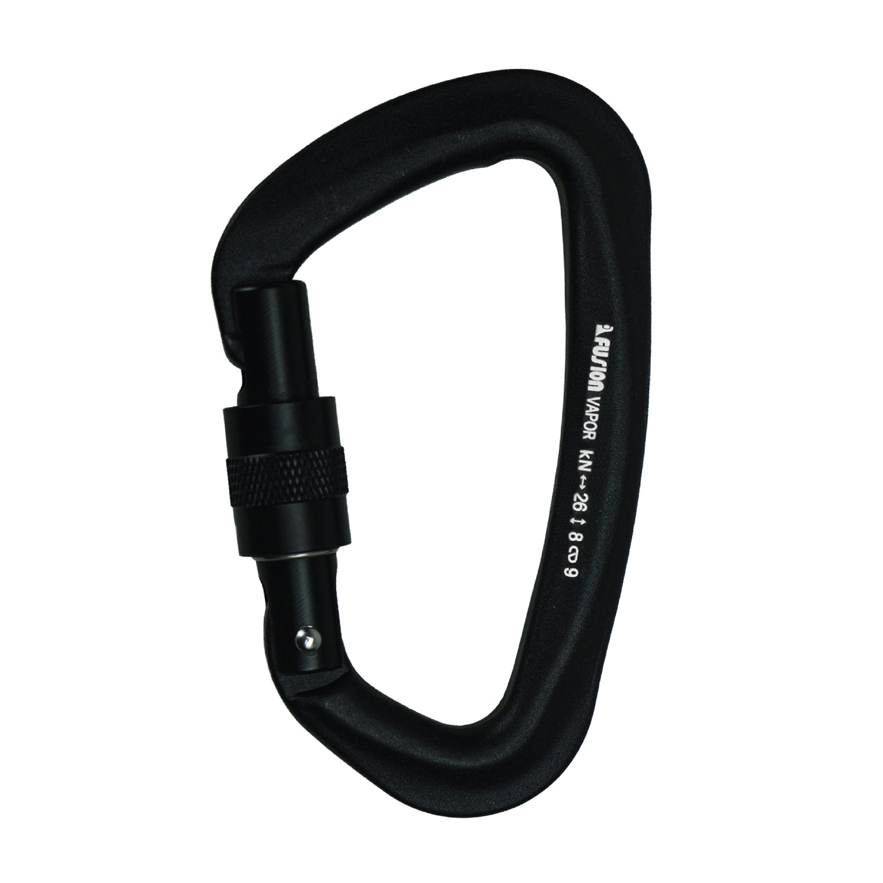 The Vapor IV screw gate aluminum carabiner in black features an asymmetrical shape and concave gate for easy rope clipping. Hot-forged aluminum alloy makes it lightweight and strong. Non-locking and CE EN12275 certified, perfect for climbing, rigging, and outdoor use.