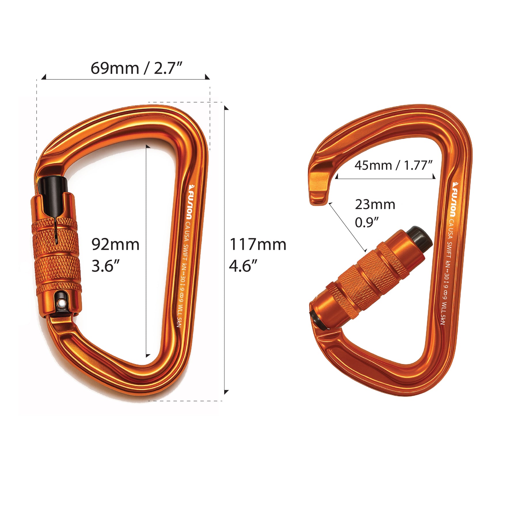 The Swift auto locking aluminum carabiner in orange and black features a lightweight, modified D-shape for strength. Auto-locking gate and pin nose add safety and security. Ideal for climbing, rigging, or outdoor use where weight and performance matter.
