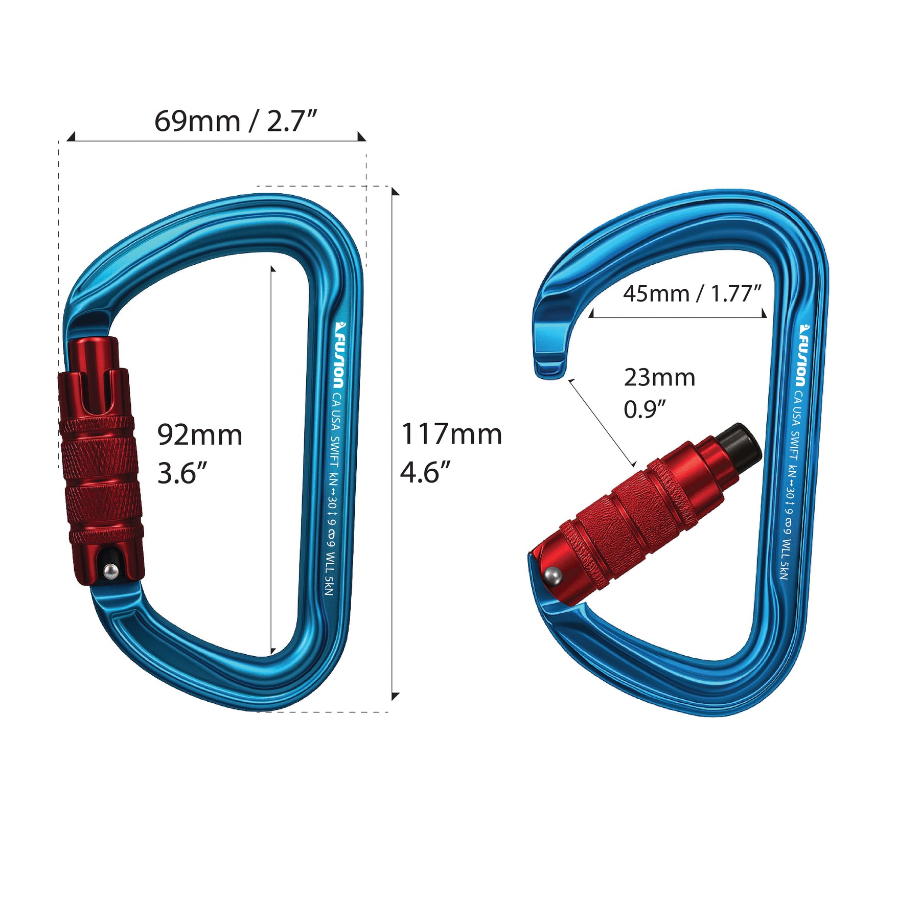 The Swift triple locking aluminum carabiner in Red and blue features a modified D-shape for strength and light weight. Triple locking gate ensures extra security, and the pin nose design offers strong, snag-free performance. Ideal for climbing, rigging, and outdoor use where safety and reliability matter.