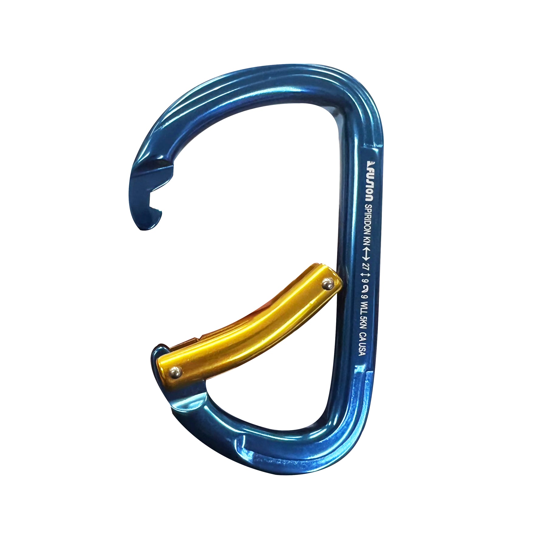 The Spiridon aluminum bend gate carabiner in blue is lightweight and strong, featuring a locking gate and modified D-shape for maximum load distribution. Pin nose design adds strength and prevents snags. Ideal for climbing, belaying, and gear organization in outdoor adventures.